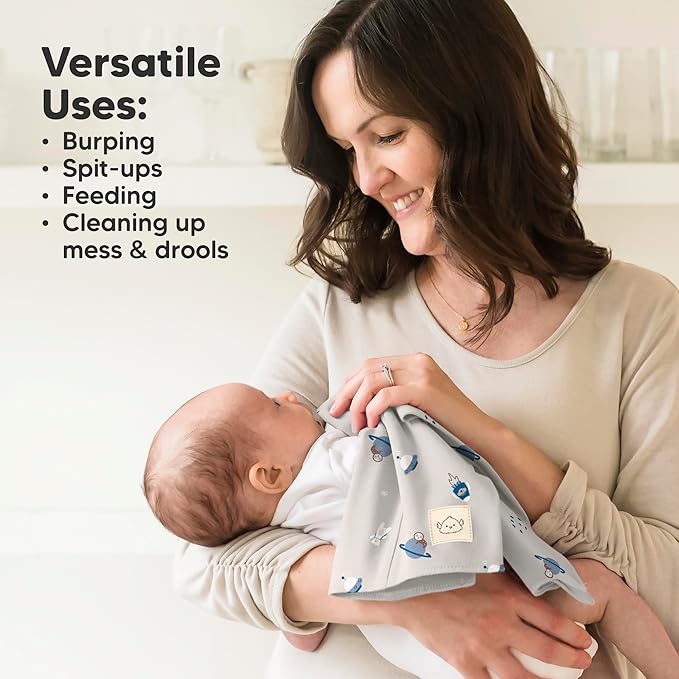 • Super Absorbent, Catches Liquid Well - These burping cloths for babies sits on your shoulder comfortably, and the thick organic cotton catches rolling liquid and spit ups well.