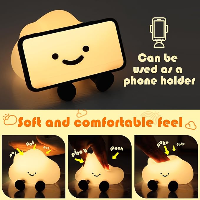 • Dimmable & Timer: The soft warm light won’t flicker or hurt your eyes. Cute cloud light has 3 warm light modes, you can easily adjust the light intensity. The squishy night light also has a 30-minute timer shut-off function, no need to manually close