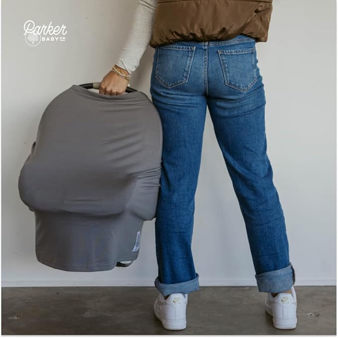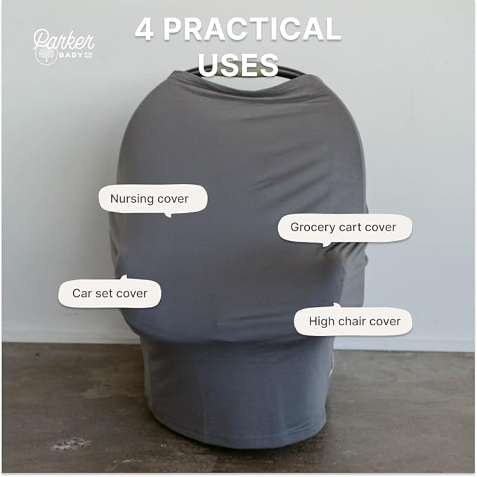 Parker Baby 4 in 1 Car Seat Cover for Girls and Boys - Stretchy Carseat Canopy, Nursing Cover, Grocery Cart Cover, High Chair Cover - “Pewter”