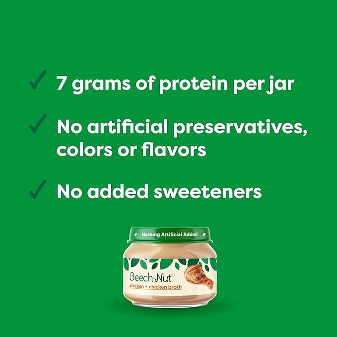 • 7G OF PROTEIN FOR BABY: Beech-Nut Meat Baby Food is a savory blend of real pureed chicken & chicken broth. Each jar contains 7 grams of protein to help keep baby full.