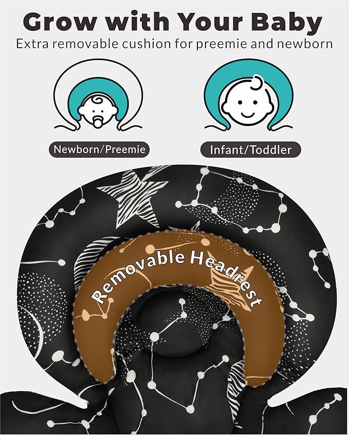 Infant Car Seat Insert with Removable Cushion for Preemie to Toddler, Reversible Newborn Carseat Insert for Baby Head Body Support, Fits for Stroller, Baby Swing, Bouncer (Black Star)