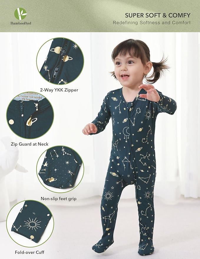 • FUNCTIONAL DESIGN: Built in footies design can keep babies warm when they sleep and play. Double zippers are perfect for new parents for quick diaper or outfit changes. Neck tab can cover the zipper to keep it away from the chin. Fold-over mitten prevents babies from scratching themselves.