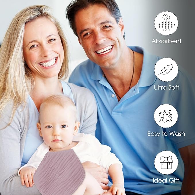 • Luxuriously Soft - Our muslin burp cloths and infant washcloths are fluffy and ultra-soft, like a cozy cloud. Sized at 12x12 inches, they provide generous coverage for everyday use, from bath time to feeding cleanup.