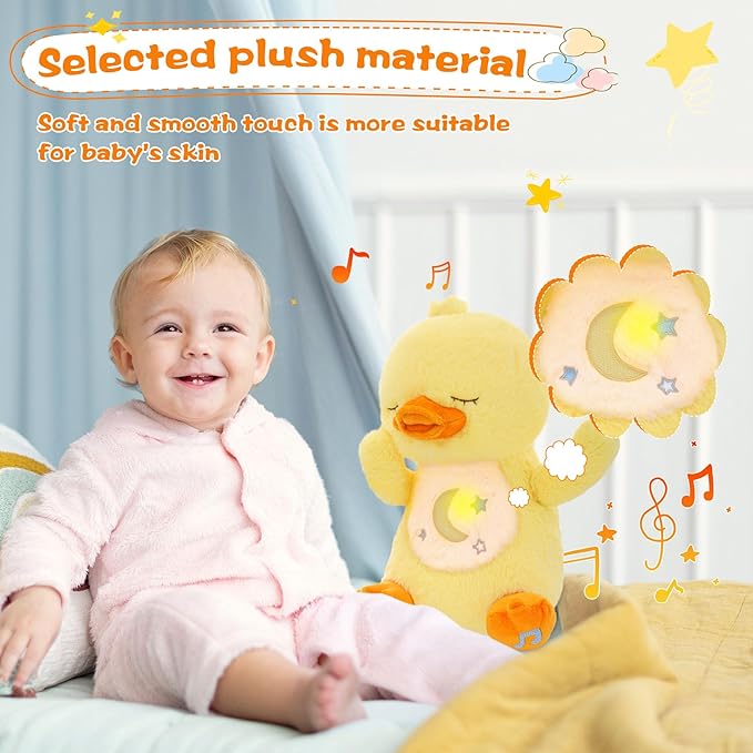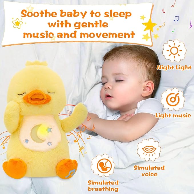 • 【Soothing Sleep Companion】The breathing duck plush toy features a soft music and subtle lighting that mimics the natural gentle “breathing” motion. These elements combine to create a multi-sensory experience that can help lull your baby to sleep or soothe them when they are irritable in the middle of the night