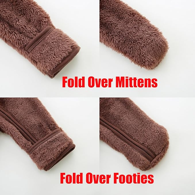 • Mitten Cuffs and Footed Design - Baby winter fleece outfit has an solid color design and a bear ear hood, and all size have reversible mitten cuff and footed design to keep baby's hands and foot preventing them from scratching