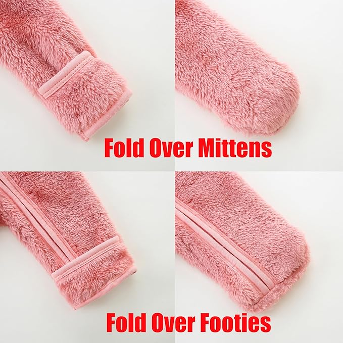 • Mitten Cuffs and Footed Design - Baby winter fleece outfit has an solid color design and a bear ear hood, and all size have reversible mitten cuff and footed design to keep baby's hands and foot preventing them from scratching