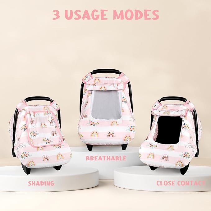 Pea Pod Car Seat Cover Baby, Infant Car Seat Canopy Covers for Newborn with 2 Layers Windows of Breathable Mesh Fabric, Lightweight Polyester/Soft Minky Dot Backing (Floral & Rainbow)