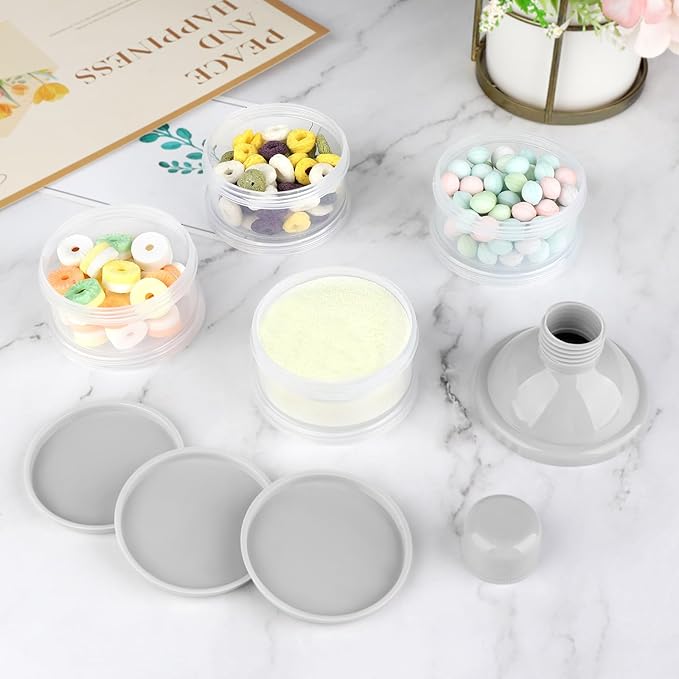 • Capacity - 4 layers design. You can put quantity of baby formula on each layer. A total of 4 layers of pre measured milk powder or food can be placed. Very pratical formula container for on the go.