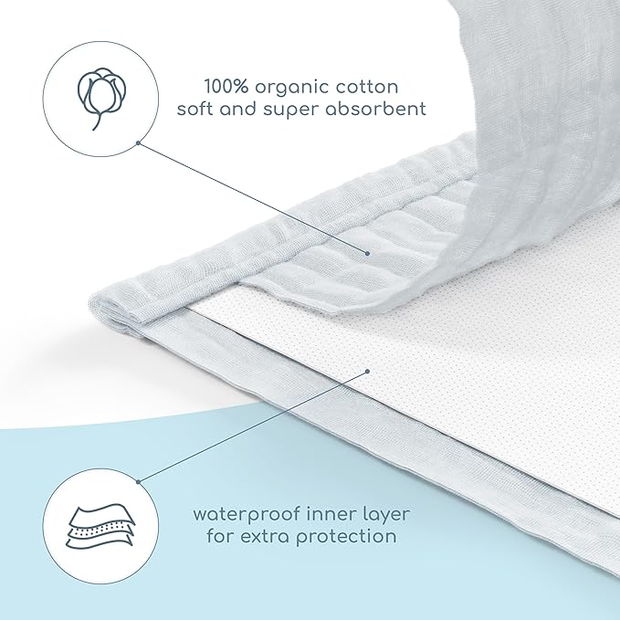 • 100% Natural Muslin Cotton top layer and waterproof inner layer - Our Muslin burp cloths are made of 100% organic cotton. It has a soft, pleasant structure of the fabric that easily absorbs moisture. It is breathable and skin-friendly with a lovely fluffy touch.