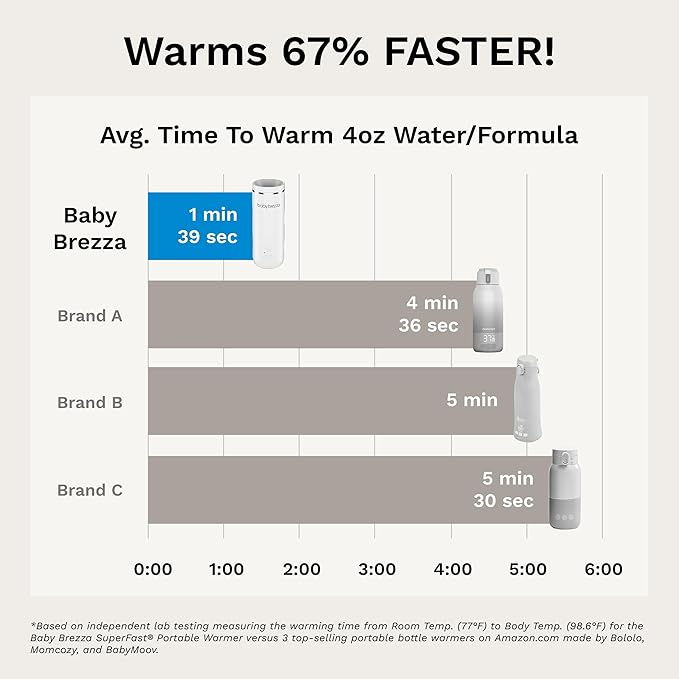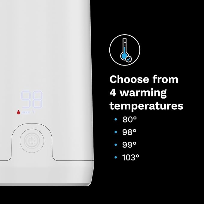 • WARMS FASTEST – 3X FASTER THAN OTHER PORTABLE WARMERS: Warms 8 oz in 3 min (from room temp to 98°F); 3x stronger warmer (100 vs 60 watts); Choose from 4 temps - 80°F, 98°F or 103°F for formula/water, or 99°F for milk storage bags