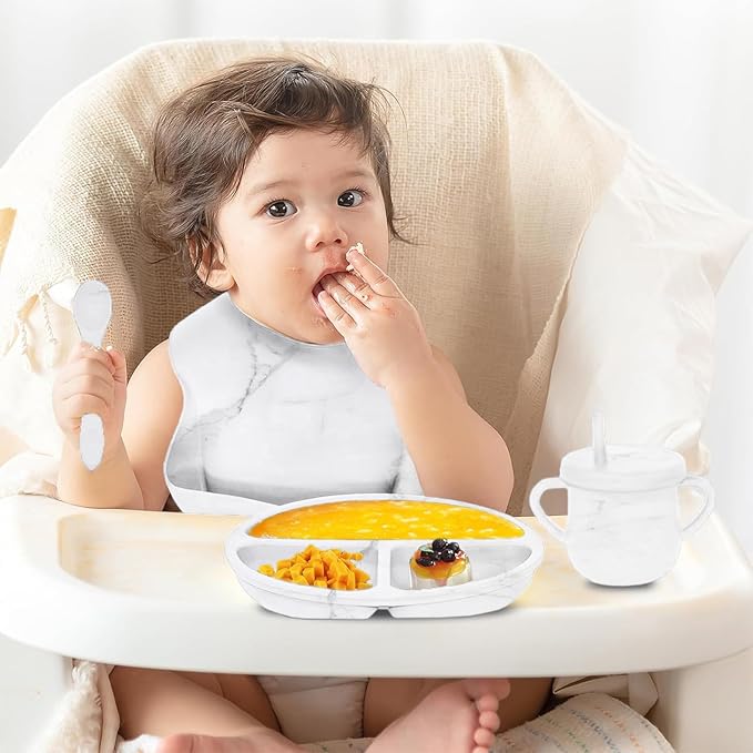 • 9 pcs Silicone Baby Feeding Set :our silicone baby feeding set includes 1 adjustable bib with a food catcher, 1 suction divided plate, 1 suction bowl, 1 training straw sippy cup, and 2 sets of spoon and fork.