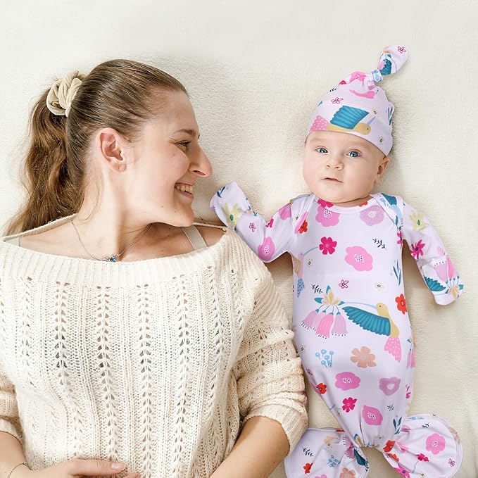 Newborn Baby Girl Gown 0-6 Months, Super Soft Newborn Sleepers Gown, Long Sleeve Infant Nightgown for Girls, Baby Girl Outfit Essential with Folding Gloves Hat Set Flower Bird