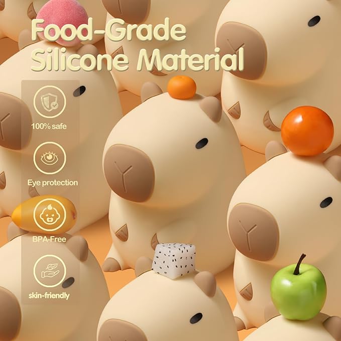 • [BPA-free] Capybara Night Light is made of safe and non-toxic food-grade silicone. As a touch-controlled baby night light that comes into contact with the body every day, we use the highest grade food-grade silicone that is BPA-free. Soft silicone can be kneaded freely and springs back quickly. The silicone exterior is thickened to prevent easy breakage or damage. It can be your stress reliever instantly. It is a baby night light and a stress relief toy.