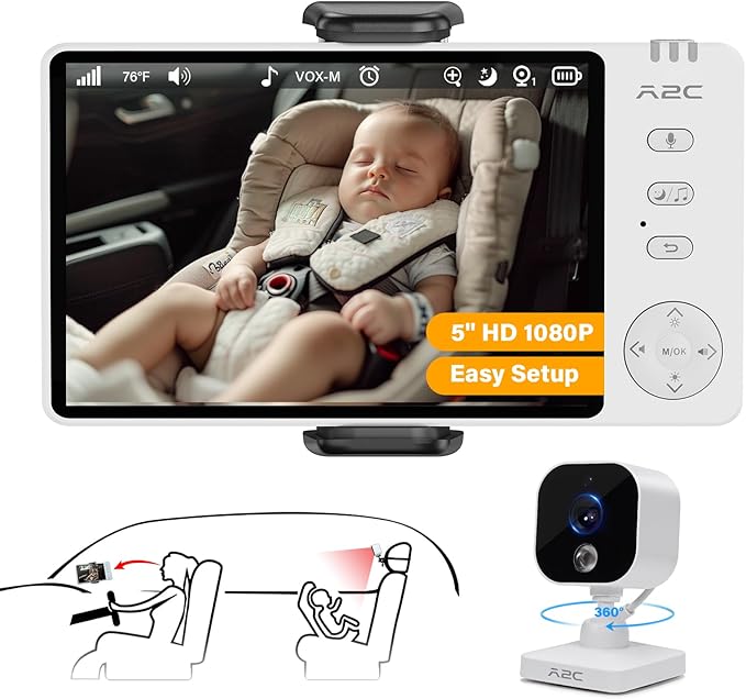 A2C Baby Car Camera, 5" 1080P HD Baby Monitor with Night Vision & VOX Mode, Rear-Facing Car Seat Monitor for Backseat & Home, 1000FT Range, USB Powered Plug & Play (No WiFi Needed)