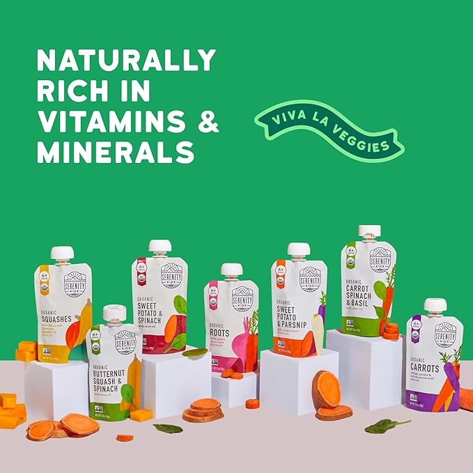 • Veggie Powerhouse: Dive into the veggie revolution with Serenity Kids Organic Baby Food Pouches. Packed with organic veggies and healthy fats, these baby snacks and baby pouches are perfect for little foodies without any added sugar