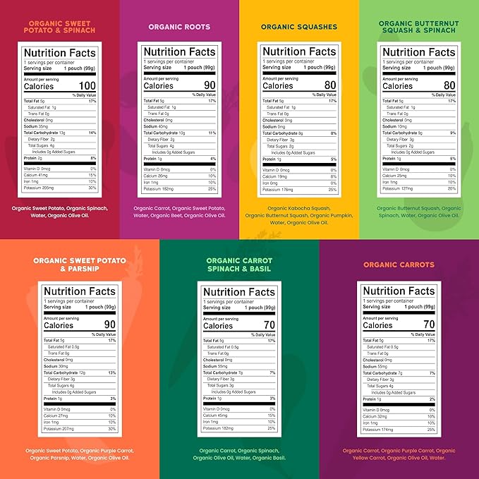 • Savory Blends, No Sugar: Our veggie pouches pack more protein and fats than sugar, making them perfect baby feeding essentials. Let your little one explore bold flavors and leave sugary baby snacks behind with these nutritious toddler food options