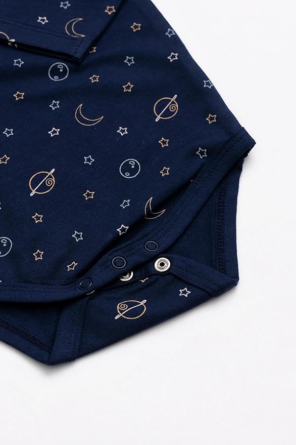 • Our unisex bodysuit available in a 3-pack is designed to make your life easy. Overlap shoulders make it a cinch to put on over baby’s head. And snaps at the inseam make diaper changes, well, a snap.
