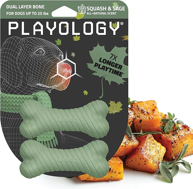 Playology Dog Toys | Dual Layer Bone Durable Chew Toy Bone for Dogs, Value 2-Pack | Small Butternut Squash Scented Toy - Limited Edition Fall Scent | Easy to Clean and Made from Non Toxic Materials