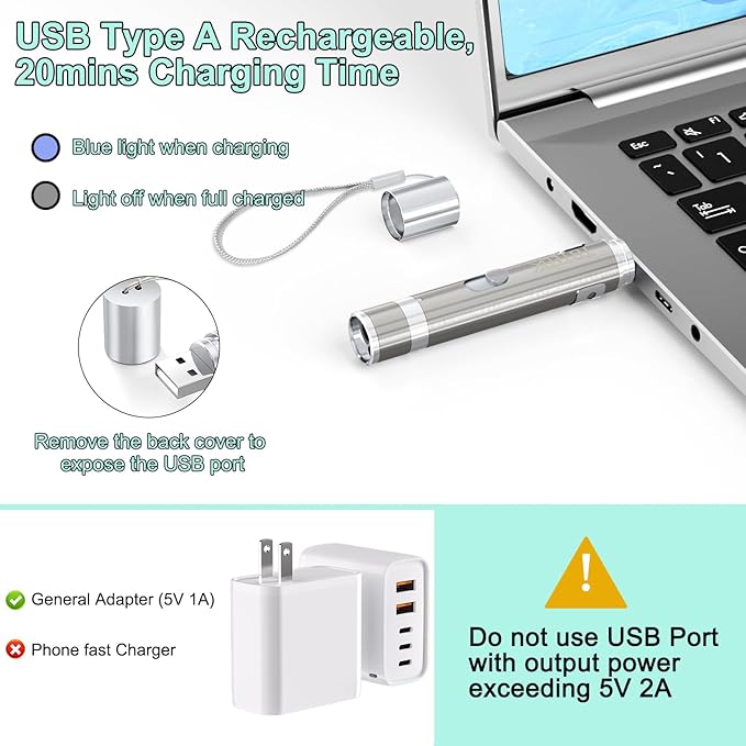 • USB Direct Charging: No dry batteries needed! Unplug the back cover and plug into USB port (adapter/computer/car) to charge, about 20mins fully charged.