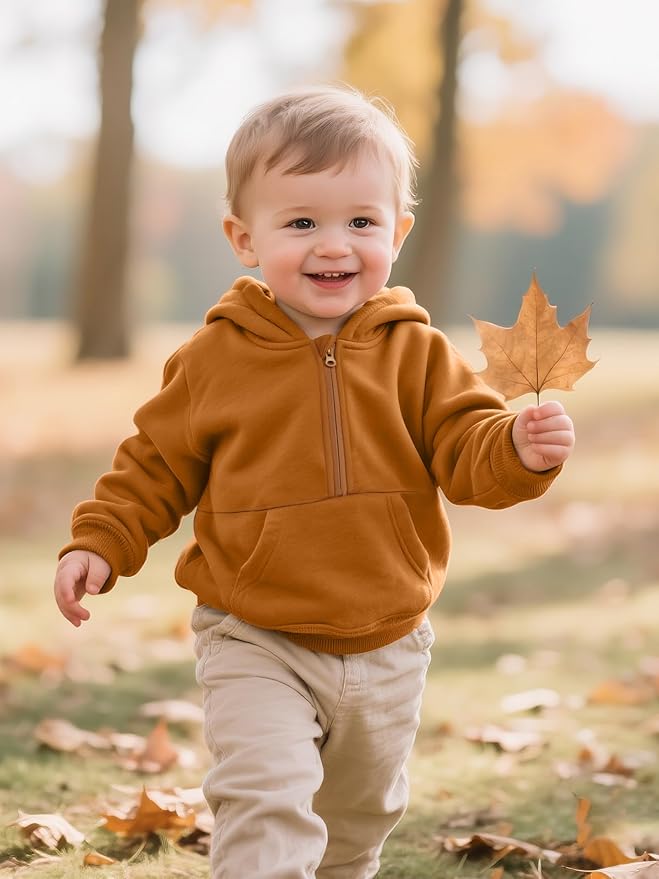 • Design Strengths: new half-zip style is more suitable for children to wear than regular pullover hoodies, kangaroo pockets on the front to carry things, with a large hood to provide extra warmth when you pull it up to cover your head, long sleeve with ribbed cuff and bottom, loose fitting shoulder give more activity space for exercise or training, giving toddler boys wonderful wearing experience