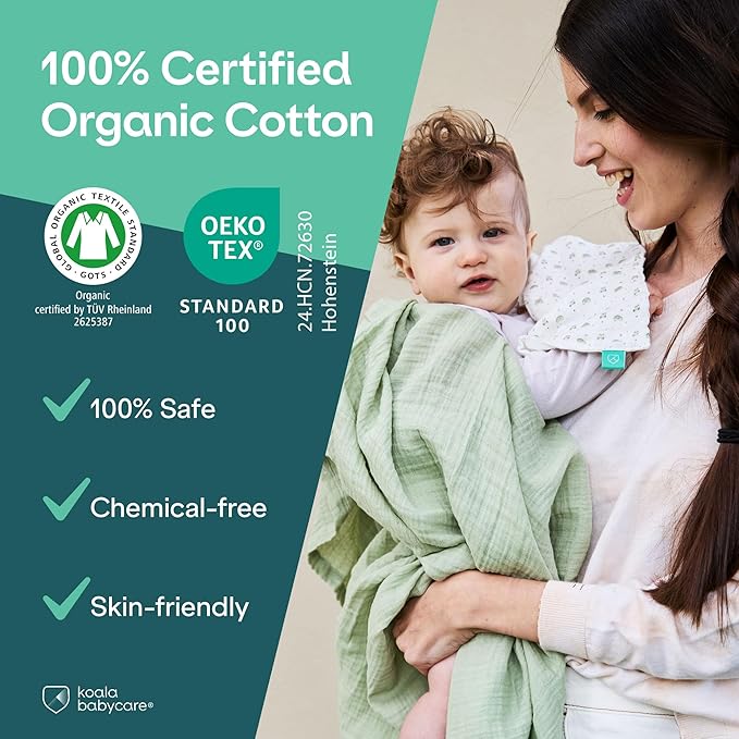 • Certified Organic Cotton – GOTS & OEKO-TEX for Ultimate Baby Safety: Premium muslin burp cloths is made from 100% GOTS certified organic cotton and OEKO-TEX Standard 100 certified, ensuring your baby is surrounded only by safe, chemical-free materials. These global certifications guarantee that every fiber has been tested against harmful substances and grown without pesticides or toxins. The result? A breathable, skin-friendly fabric that’s trusted by conscious parents worldwide