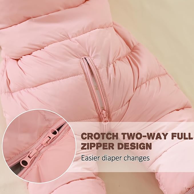 • Attentive Design: Attentive two-way full-zipper boys girls warm jumpsuit making it easier to wearing. The crotch two-way zipper design of baby boy snowsuit makes facilitates diaper changes. The elastic ribbed cuffs and hem of baby bear snowsuit ensure baby's hands and legs stay inside while more windproof.Full body wind protection toddler snow suit is really ideal for cold weather.
