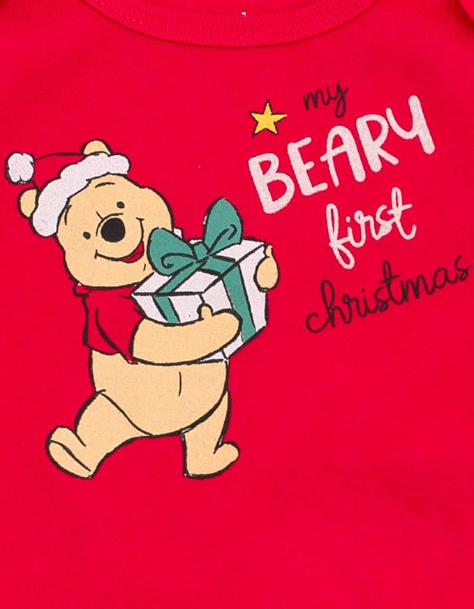 • Vibrant screen print "My Beary First Christmas" design with glitter details; All over print design; Bodysuit with rib knit binding; Lap shoulders for easy dressing; 3-snap closure for quick and easy diaper changes; Rib knit crew neck collar; Ruffled trim; Elastic waist for comfortable stretch and a better fit; 3D Bow; Screen printed applique; Elastic knotted headband