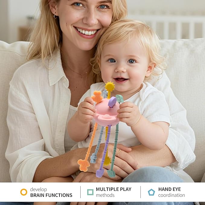 • Montessori Sensory Toy for Fine Motor Skills: This Montessori-inspired toy is designed for babies 6+ months old. It offers a rich sensory experience with pullable ropes of varying shapes and textures, along with a soft, pressable button. These activities help toddlers develop fine motor skills, strengthen hand-eye coordination, and improve their grasping ability. The diverse play options also stimulate your baby’s curiosity and encourage them to explore cause and effect.