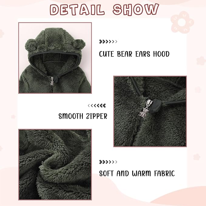 • [Cute Design] As a fleece jacket with hood for cute baby toddler, the winter jacket design is also very adorable, not only the fleece fabric gives a soft feeling, but the bear ears on the hood are more important. Your baby will look like a cute bear in this jacket, and we also offer a variety of different colors to choose from, such as brown, pink, khaki and more. Choose your favorite style for your baby!
