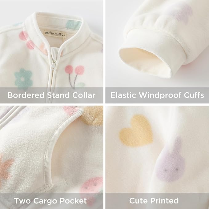 • 【Lightweight & Warm Fleece Jacket】Made of premium polyester fleece, DAVE&BELLA unisex baby fleece jacket is skin-friendly, low-pilling and low-shedding. The non-bulky design layers easily over shirts in spring/fall or under coats in winter, offering warmth without stiffness. The kids printed polar fleece jacket balances warmth and freedom of movement—ideal for playgrounds, school, or travel. Designed to stay comfy in car seats and during all-day adventures.