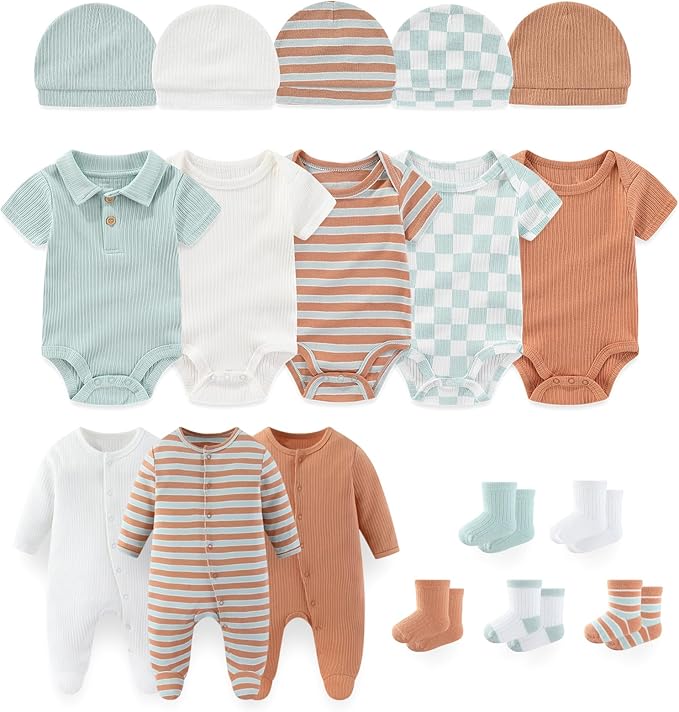 • Packaging: This combination set includes 5 bodysuits, 3 jumpsuits, 5 hats and 5 pairs of socks, making it convenient for new parents to match
