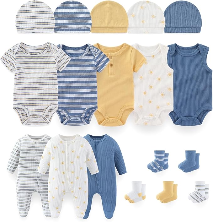 • Packaging: This combination set includes 5 bodysuits, 3 jumpsuits, 5 hats and 5 pairs of socks, making it convenient for new parents to match