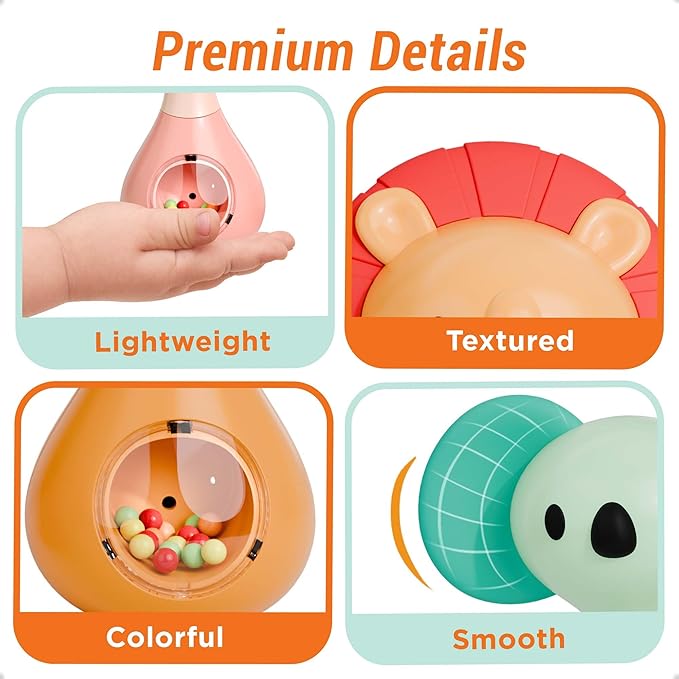• 【Sensory & Skills Growth】Designed for baby's little hands, its contoured shape and light weight make grasping, holding, and shaking effortless. Successfully holding and shaking them helps strengthen the baby's finger muscles, improve hand-eye coordination, and master fine motor skills.
