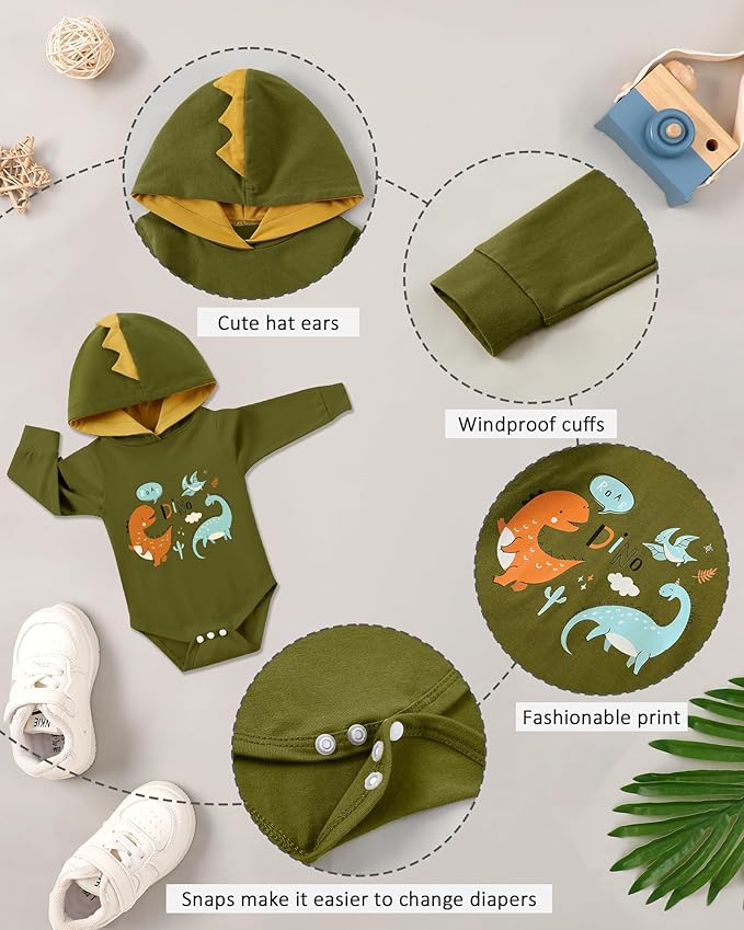 • Unique design:Features adorable animal ear romper and matching printed pants with an easy-access snap/zip closure for stress-free diaper changes.