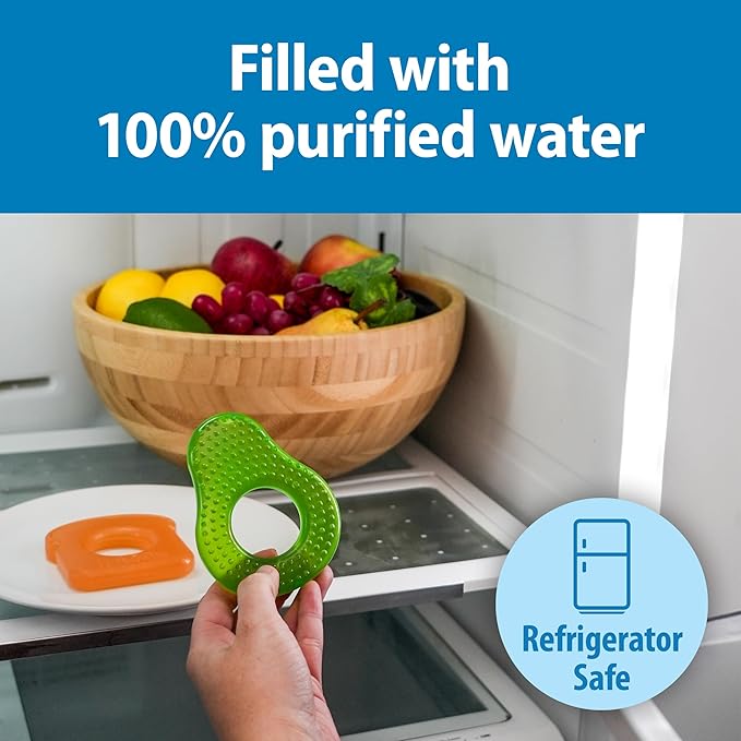 • QUICKLY SOOTHE SORE GUMS. Designed to be placed in the refrigerator, the teething toy is filled with 100% purified water to cool and soothe all areas of the mouth giving baby relief from teething discomfort.