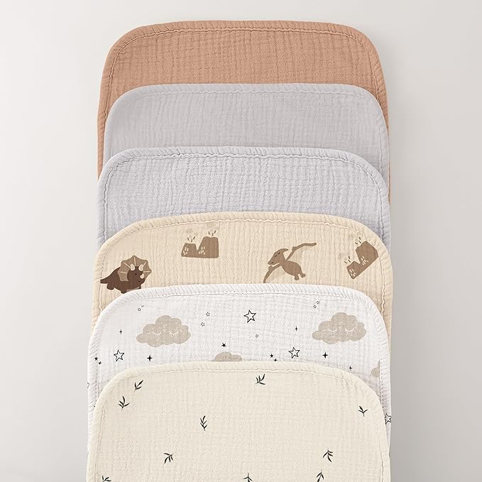 • 100% Cotton- Bearmoss Muslin Burp Cloths are made of pure natural muslin cotton, ensuring that they are soft, breathable, and gentle on your baby's delicate skin. The combination of muslin cotton on the front and thick cotton terry on the back provides exceptional softness, absorbency, and durability.