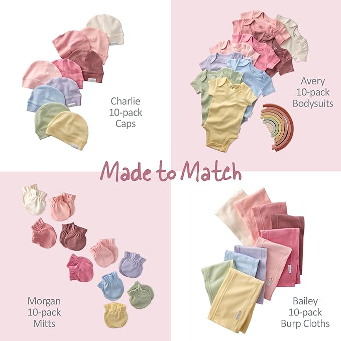• MADE TO MATCH: Designed just for you in a 10-pack of happy hues in rainbow colors, these long sleeve bodysuits are made to match with perfectly coordinating pants, caps, mitts and so much more!
