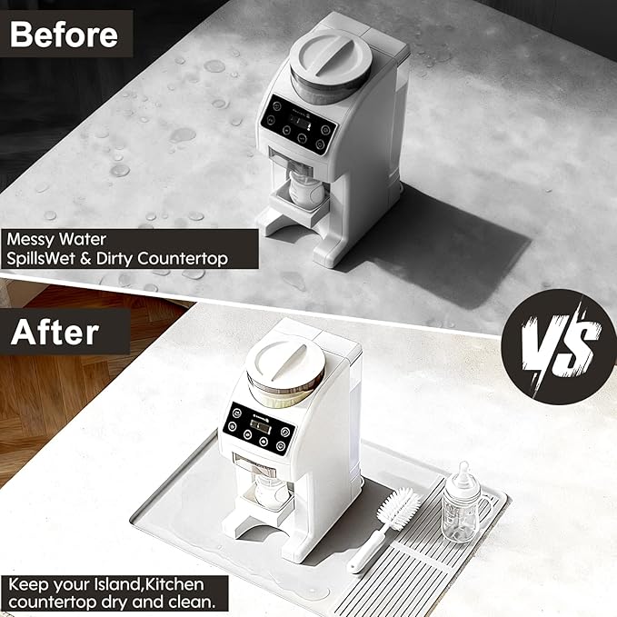 • Compatible with Most Formula Dispenser Machine: Our bottle maker formula machine mat set is specially designed for new parents, ensuring exceptional durability.Its large 24"x16" size works seamlessly with most formula dispenser machine on the market.Plus, the included 16"x7.5" draining mat makes it effortless to store bottles, cups, and other containers.