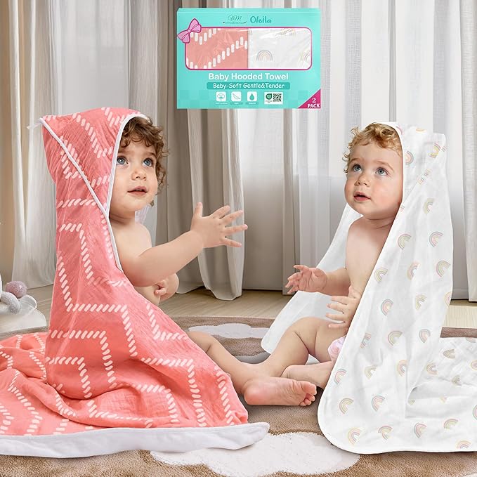 VOOVA & MOVAS 2Pack Hooded Baby Towels - 100% Muslin Cotton,300GSM, 32x32 Inches,0-24Months, Super Absorbent Large Bath Towel with Hood for Newborn,Toddler,Infant, Pink Geometry & Rainbow Patten
