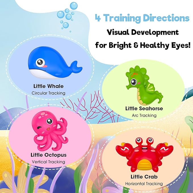 • 👀 【Visual Tracking for Healthy Development】Support your baby's visual development with four adorable marine friends that swim through different tracking patterns: Little Whale circles, Little Seahorse arcs, Little Octopus bobs vertically, and Little Crab moves sideways. These engaging motions encourage coordinated eye movement and focus, helping prevent strabismus and cross-eyed conditions.