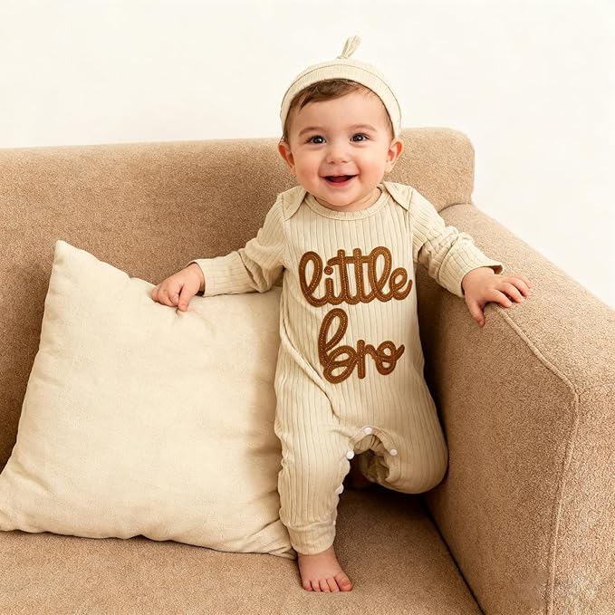 • Design: Newborn baby boy outfits, little brother outfits, cute newborn outfit, baby boy ribbed jumpsuit; Little brother romper long sleeve bodysuit and hat set; Long sleeve round neck letter embroidery romper the exquisite design details will make your little boys cute and charming