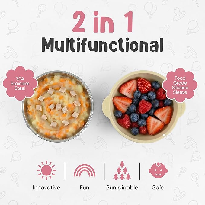 • ๐‘๐ž๐ฆ๐จ๐ฏ๐š๐›๐ฅ๐ž ๐’๐ญ๐š๐ข๐ง๐ฅ๐ž๐ฌ๐ฌ-๐’๐ญ๐ž๐ž๐ฅ ๐ˆ๐ง๐ฌ๐ž๐ซ๐ญ ๐Ÿ๐จ๐ซ ๐„๐š๐ฌ๐ฒ ๐‚๐ฅ๐ž๐š๐ง๐ข๐ง๐ : Each stainless steel baby bowl includes a removable inner bowl thatโ€™s easy to lift and clean. The metal insert can be used independently for meals or heating โ€” simplifying hygiene for busy parents.