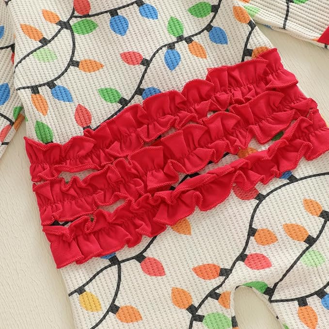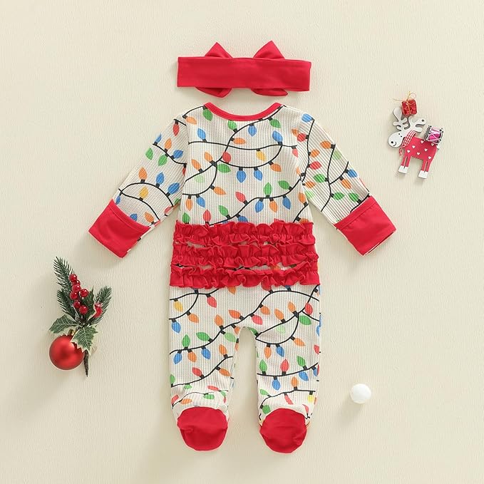 • Features: Newborn baby christmas outfit has long sleeves, crew neck, lights string print, front zipper closure, back ruffles details, cute hat or headband,one piece waffle jumpsuit, make your little one more adorable