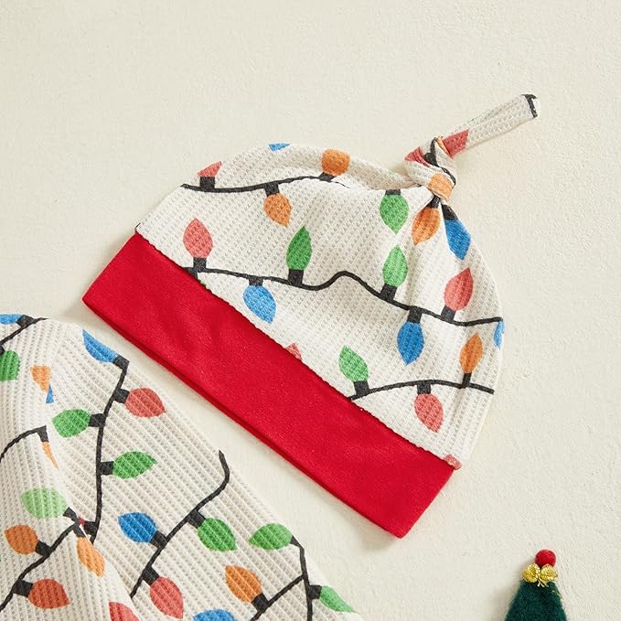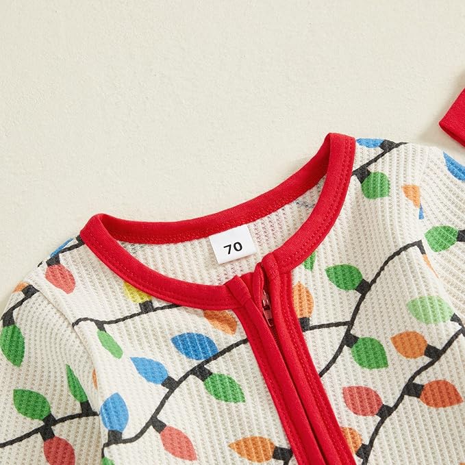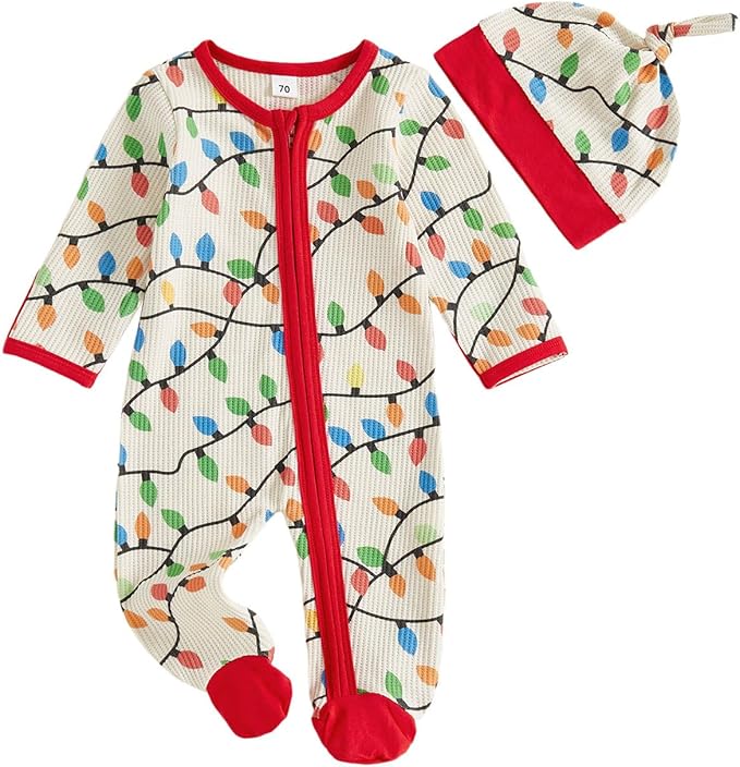 • Features: Newborn baby christmas outfit has long sleeves, crew neck, lights string print, front zipper closure, back ruffles details, cute hat or headband,one piece waffle jumpsuit, make your little one more adorable