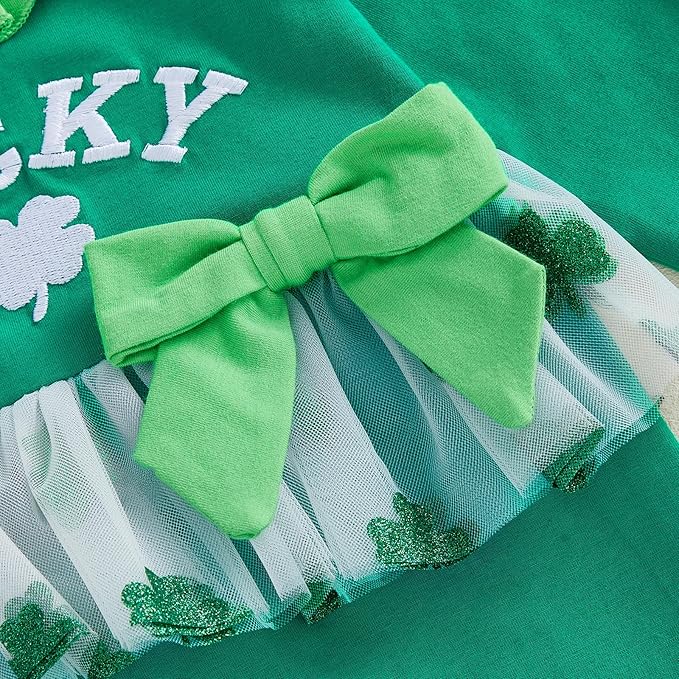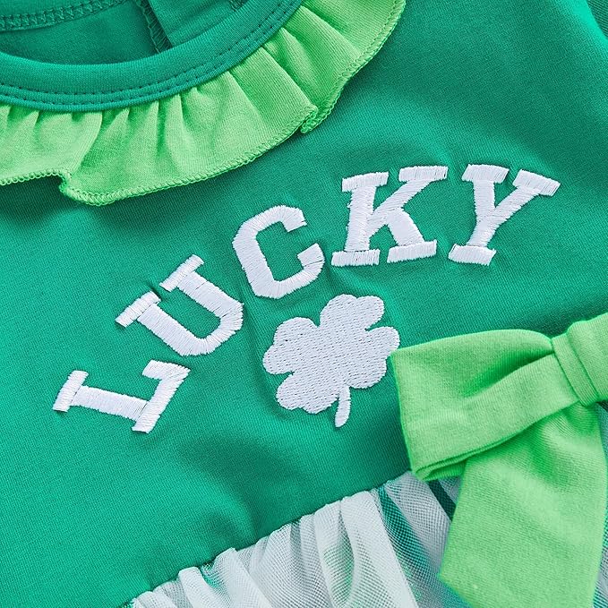 • Craftsmanship Design: The newborn romper is exquisitely crafted; Featuring lucky charm letter and and clover embroidery, tulle tutu ruffle dress romper, and sweet bows onesie, vintage ruffle trim neck, paired with a headband, unique and stylish
