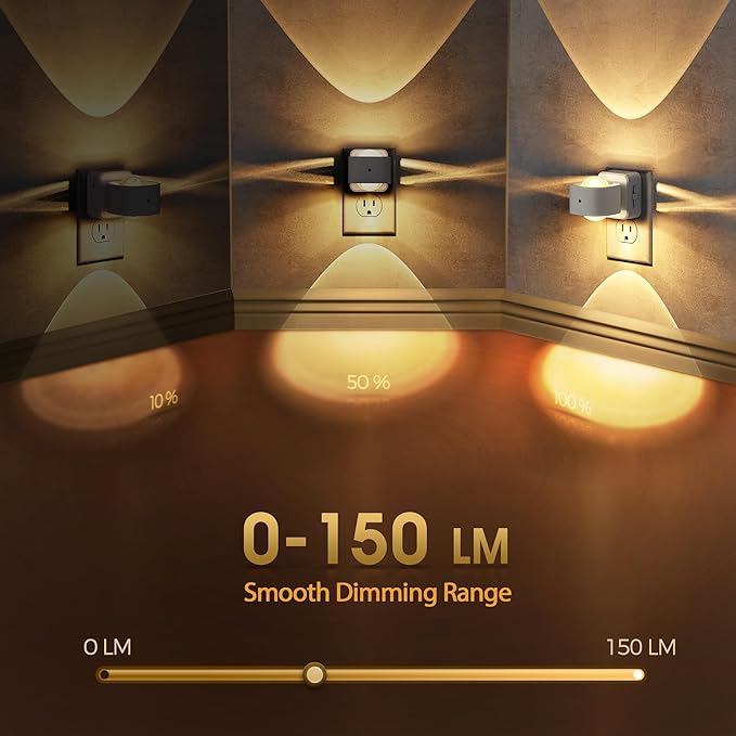• Adjustable Brightness - Smooth sliding dimmer allows brightness adjustment from 0% to 100%. Customize your plug in night light intensity to create the perfect ambiance for any time of night.