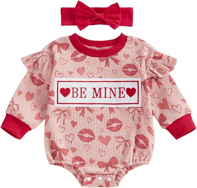 Newborn Baby Girl Valentines Day Outfit Ruffles Bow Footie Long Sleeve Romper Jumpsuit Bodysuit Overalls Fall Clothes