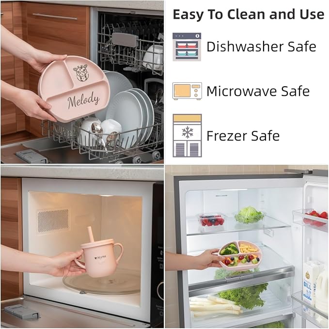 • 🚨 SAFETY FIRST: We worry about safety for your child, so you don’t have to! We customize your baby's name and logo with laser, No ink!Each piece of our 6 piece feeding set is made from 100% Food Grade silicone, is 3rd party tested at every level of production, and is free from BPA, Phthaltes, Lead, and harmful chemicals.