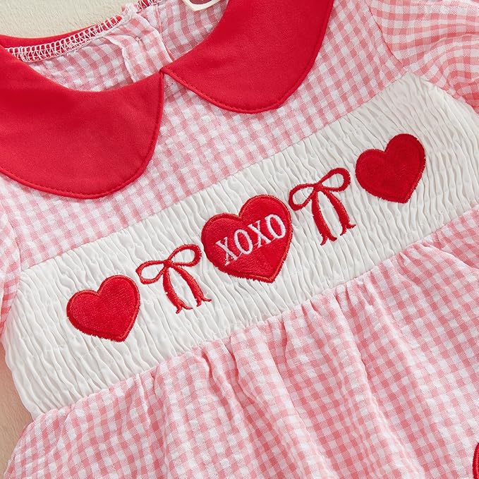 Baby Girl Valentines Day Outfit Newborn Romper Dress Heart Embroidery Puff Short Sleeve Plaid Skirt Hem Jumpsuit