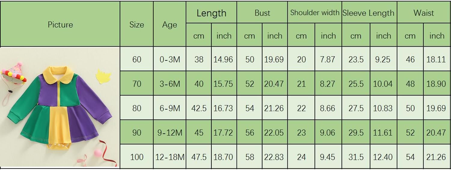 • Size: Mardi Gras baby girl clothes 0-3 months, 3-6 months baby girl Mardi Gras clothing, infant girl Mardi Gras carnival outfit6-9 months, carnival baby girl clothes 9-12 months, 12-18 months baby girl long sleeve patchwork romper dress